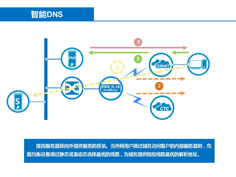 為(wèi)外(wài)網用(yòng)戶提供內(nèi)部服務器(qì)智能(néng)解析服務功能(néng),解決由外(wài)網訪問(wèn)內(nèi)網服務器(qì)鏈路(lù)&選擇的(de)問(wèn)題。