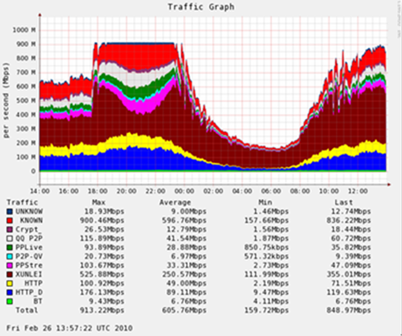 如(rú)上(shàng)圖所示,在18:30-22:30,随著(zhe)高(gāo)優先級應用(yòng)(對(duì)用(yòng)戶體(tǐ)驗影(yǐng)響直接的×(de)應用(yòng))流量上(shàng)升,受限應用(yòng)(棕色的(de)迅雷)流量明(míng)顯被壓縮,流量總量幾乎是(shì)一(yī)條直線,充分(fēn)利用(y↔òng)了(le)帶寬資源,同時(shí)保障了(le)高(gāo)優先級應用(yòng)的(de)帶寬。
