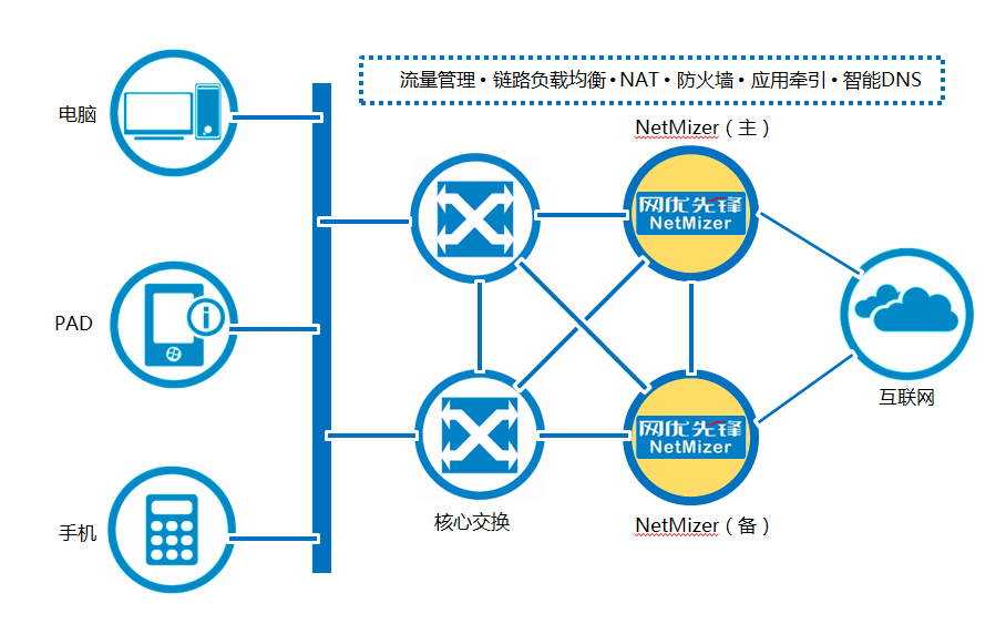 ● 集成部署模式:設備部署在核心交換機(jī)和(hé)各出口鏈路(lù)之間(jiān),網絡優化(huφà)出口優化(huà)設備負責做(zuò)流控、負載均衡、NAT、實施防火(huǒ)牆策略。這(zhè)種模式可(kě)以極大(dà)地(dì)簡化(huà)網絡拓撲,減少(shǎo)故障點,對→(duì)于做(zuò)雙機(jī)熱(rè)備将非常方便。